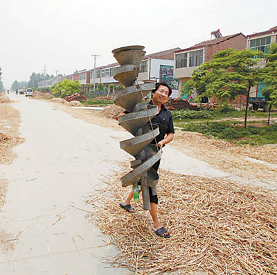 永城市李寨镇的一位村民抬着种子分拣机,准备播种黄豆。