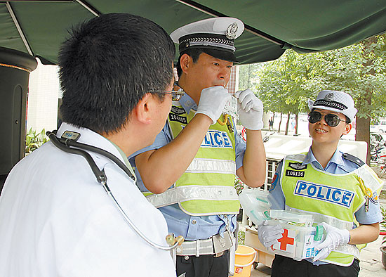 7月3日,重庆西南医院的志愿者给在街头执勤的交巡警送来清凉解暑的药品。连日来,我国许多地区饱受高温炙烤,四川、重庆等地出现局地38~40℃的高温天气。素有“火炉”之称的重庆市,积极组织志愿者深入到许多室外工作的岗位点,开展防暑降温服务活动。冯毅摄
