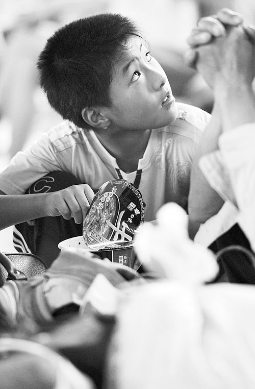 7月8日,一名小朋友在合肥火车站候车室中吃方便面。