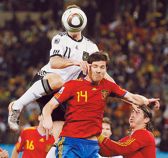 7月8日,西班牙队在南非世界杯半决赛中,以1∶0小胜德国队,与荷兰队会师决赛。图为德国球员克洛泽(上)与西班牙球员阿隆索在争抢头球。CFP供图