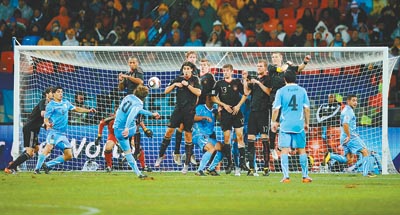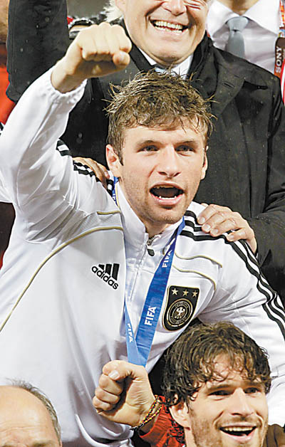 7月11日,经过一场开放的对攻,德国队3∶2击败乌拉圭队获得南非世界杯赛第三名。终场前,乌拉圭球星弗兰主罚的任意球击中横梁,给这场季军之战画上圆满句号。