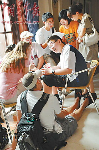 7月7日,中外学生在上海音乐厅的演出间隙交流。