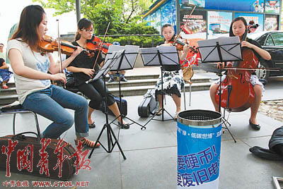 7月8日,青年低碳嘉年华活动在上海静安公园举行,上海交通大学学生乐团在回收废旧电池的垃圾桶前演奏。