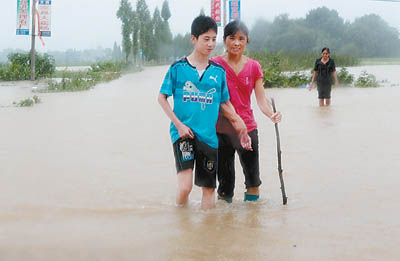 7月13日,安徽省桐城市双港镇,村民们小心翼翼地在漫过路面的洪水中行走。