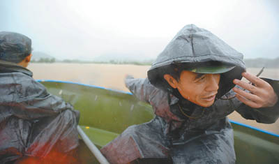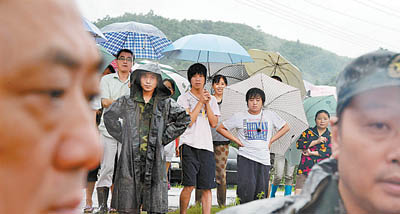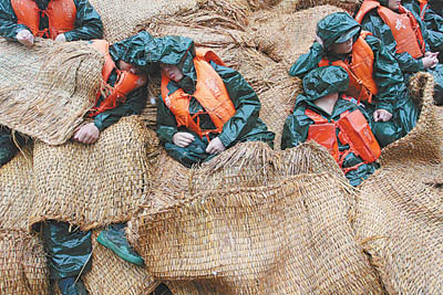 7月13日,安徽省桐城市青草镇,武警战士正在为爆破拦水坝做最后的准备工作。7月11,受到特大暴雨袭击,长江支流大沙河干堤多处坍塌溃破、漫堤、涵闸出险,青草镇拦河坝岸堤决口近200米。原先计划以爆破大坝的方式分流河岸侧面洪峰,后来因水流陡然增大被临时取消。