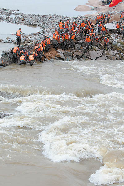 据现场准备实施爆破的人员介绍,因为陡然增大的水流冲断了爆炸装置的引线,短期内不会对拦河坝实施爆破。