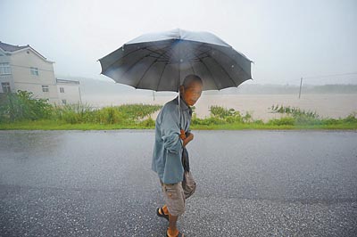 7月13日,安徽省池州市贵池区白洋村,一位村民打着伞从洪流旁走过。
