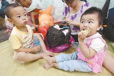 7月13日,安徽省桐城市双港镇双铺中学灾民安置点,一个小朋友正在啃方便面。