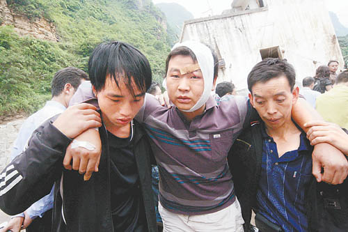 7月13日,在云南昭通市巧家县小河镇,受伤的谷永洪(中)被村民转移到安全地点,他的父母和妻子都已被洪水冲走。
