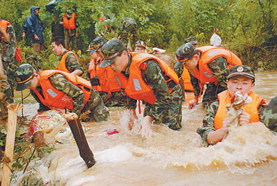 7月14日,湖南省临湘市源潭镇毛湾垸黄盖湖大堤出现9处管涌,危及附近2000余亩农田,100多户群众,情况万分危急。武警湖南总队岳阳市支队200多名官兵经过16个小时奋战,先后转战7个堤垸,修筑子堤4公里多,成功处置20余处险情。