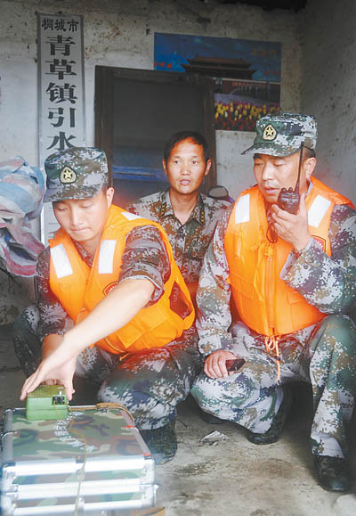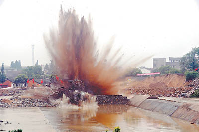7月14日上午8:58,伴随着一声巨响,安徽省安庆市桐城大沙河青草镇段20米长的拦水坝堰塞堤被瞬间炸塌,河水迅速分流,河道瞬间畅通。1小时不到,拦水坝上游水位就下降0.1米。南京军区某集团军“朱德警卫团”官兵圆满完成了此次爆破任务。