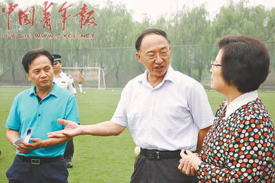 7月15日,国家体育总局局长刘鹏(中)与人大附中校长刘彭芝(左)和三高足球训练基地主任李连江交谈。