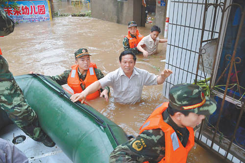 7月17日,消防官兵在广水市应山办事处东大街转移被困群众。湖北广水市7月16日晚至17日晨出现罕见的特大暴雨天气,多个地区降水量在200毫米以上,引发严重洪涝灾害。灾情发生后,广水市防汛抗旱指挥部迅速启动一级应急响应,动员各方力量抗洪救灾。