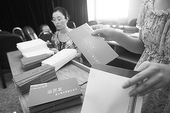7月6日上午,北京市海淀实验中学的教师将小升初红皮通知书、新生入学须知、给新生的一封信装进信封,并按照孩子所在小学分类。据了解,今年该校将接收小升初学生600多人,部分外地学生也可以通过大派位到该校就读。法制晚报/CFP