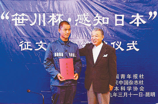 2009年3月11日,日本财团会长笹川阳平(右)在云南省第二监狱为“2008笹川杯·感知日本”有奖征文大赛二等奖获得者、服刑人员耿作伟颁发获奖证书。刘建华摄