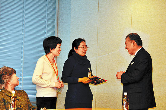 2010年1月,“2009笹川杯·感知日本”有奖征文大赛获奖者在日本东京向日本科学协会会长大岛美惠子(左一)赠送小礼品后,在一起交谈。陈为民摄