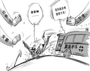 武汉一患者因在医院内误叫“黑救护车”而死在车上,该市卫生局称涉及车辆的管理责任当归属交管部门,武汉公路运输管理处则称黑救护车查处应由公安部门负责。(中国广播网7月20日)漫画:徐简