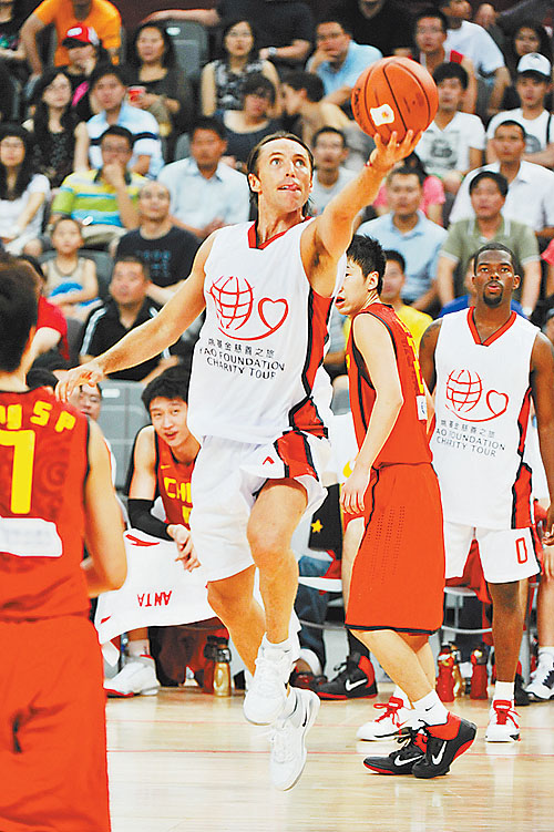 7月24日,在北京国家体育馆举行的姚基金篮球慈善赛上,NBA球星纳什是当之无愧的焦点。图为纳什上篮。CFP供图