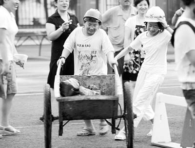 图为小选手在环保工人组的比赛中较量拉运速度。