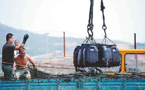7月25日,工作人员在指挥吊运装油污的油桶。大连新港输油管道爆炸事故海上清污工作目前已进入攻坚阶段,清理工作正由外向内推进,海上油污面积已缩小至约30平方公里,重点油污面积控制在8平方公里以下。辽宁海事、渔业、环保等部门启动了最大规模海上清污行动,组织协调专业清污人员1300多人,其他社会人员约5300人,清污船舶40余艘,渔船千余艘,力争保护大连海域。