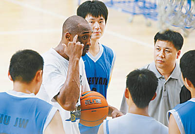 7月27日,NBA球星科比在长春市举行的球迷见面会上向小球员传授球技。