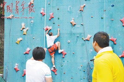 不论男队员、女队员,每个人都是跃跃欲试,初次攀岩就想攀到顶点并不容易,但队员都把攀上顶点作为自己的目标。尤其是看到别人成功之后,没有人甘于落后,连身形壮硕的田径投掷运动员都要在攀岩壁上一试身手。和队员强烈的登顶欲望相一致,大多数队员最终都成功攀顶。