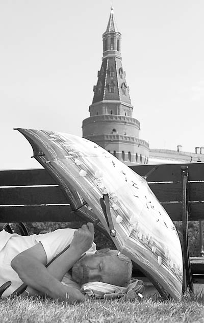 7月29日,在俄罗斯首都莫斯科,一名男子在伞下小憩。俄罗斯今年遭遇持续的高温干旱天气,首都莫斯科的气温屡创历史同日最高气温纪录。
