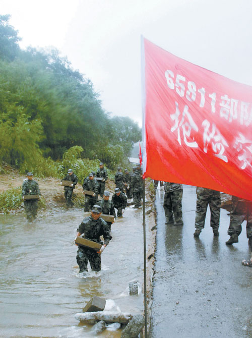 7月31日,沈阳军区某部官兵在安图县万宝镇修补被洪水冲毁的路段。当日,吉林省安图县万宝镇洪水有所减退,250名解放军官兵为这座“孤岛”打通了生命补给线,共向该镇运送60吨救灾物资,确保当地受灾群众使用10天左右。受连日暴雨影响,吉林省安图县境内大沙河河水漫堤,多条乡镇公路被大水冲毁,万宝镇等地一度成为“孤岛”。