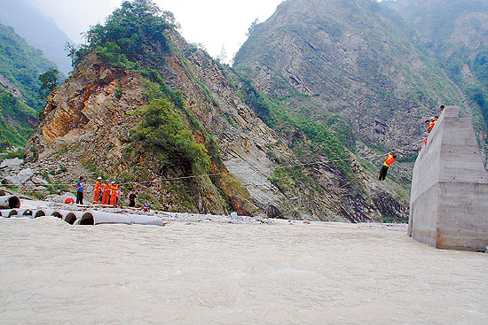 7月30日、31日,四川绵竹汉旺镇、天池乡、清平乡等沿山乡镇连降暴雨,8月1日零点至2点,四川绵竹清平乡小岗剑山出现坍塌,阻断清平河,形成近10公里长的堰塞湖,致4000多人被困。山体坍塌未造成人员伤亡。灾情发生后,当地消防武警部队和广大干部群众及时投入抗灾抢险,救援被困群众,排除堰塞湖,并全力抢通道路。新华社发