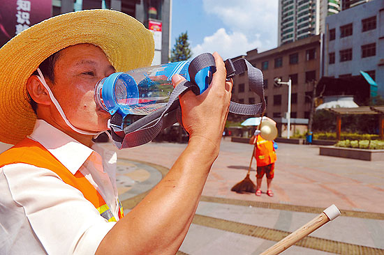 近日,贵阳市为800余名在一线工作的环卫工人配备遮阳草帽、背带式3升水壶、短袖透气棉质工装等“清凉三宝”,以人性化的服务给环卫工人带来“清凉”。新华社记者 欧东衢摄