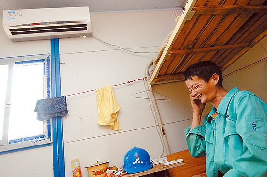 8月5日,刚下班的建筑工人钟昌水在装有空调的工棚内给亲友打电话。
