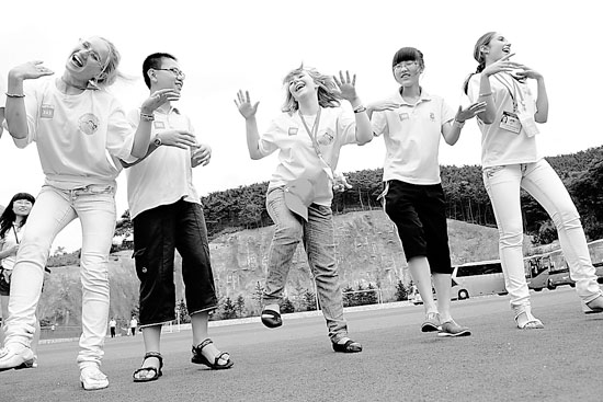 8月5日,中俄学生在一起游戏。当日,俄罗斯中小学生夏令营代表团的近300名小营员来到大连市第15中学参观交流。中俄学生一对一携手参观校园,并且在教室内互相学习对方的语言。丰富多彩的体育和文化交流活动增进了中国和俄罗斯孩子们之间的友谊。新华社记者 任勇摄