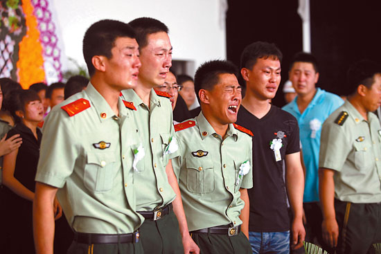 7月20日,大连市消防支队战士张良在执行“7·16”输油管道爆炸事故救援行动中,被卷入大海壮烈牺牲。追悼仪式上,战友们悲恸不已。江河/绿色和平