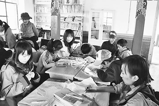 8月1日,在拉萨市曲水县南木乡保育院,中国人民大学科考队的同学正和孩子们一起彩绘云衫。科考队的19位队员在这里开展了为期两天的公益活动。此次活动得到了团拉萨市委和中国人民大学校团委的支持,共给保育院带来了价值两万元的图书和文具。
