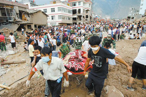 8月9日,甘肃舟曲泥石流灾区,救援人员搬运一名遇难者遗体。