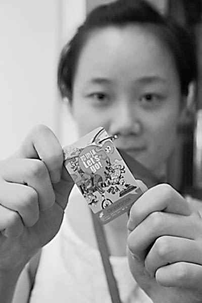 这张可爱小卡属于“迷你”型的公交卡,不到半个手掌大小,还配上一条绿色带子方便携带。正面写着“爱地球,Let’go!”,反面写着“低碳世博,绿色出行”。