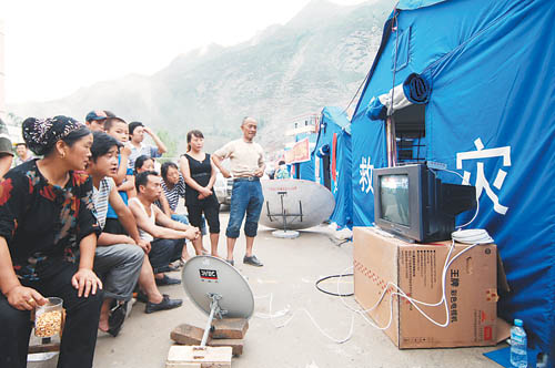 8月12日,受灾群众在舟曲三中临时安置点收看电视新闻。当日是舟曲特大山洪泥石流灾害发生后的第5天,舟曲受灾群众临时安置点的各类设施逐渐齐全,受灾群众在这里重启生活。