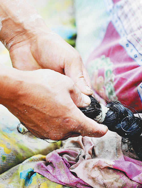 8月12日,韩如栋为女儿扎辫子。当日,救援人员将遇难的8岁女孩韩璇从5米多深的淤泥中挖出,其父亲韩如栋用清水将女儿清洗干净后,又为女儿最后一次扎辫子。