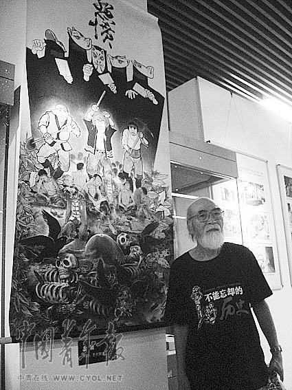 在特别展厅,87岁的日本画家志村墨然人站在自己的展出画作《悲愤》前,他也曾是画上手拿皮鞭、虐待中国劳工的监工。 本报记者 庄庆鸿摄