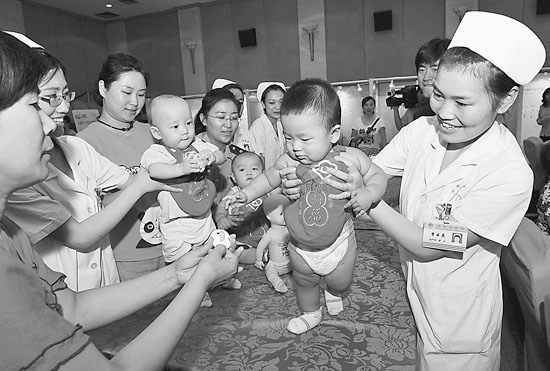 当日,全国妇联、全国心系系列活动组委会携手强生婴儿护理研究中心在北京海军总医院举行“至爱呵护科学育儿心系新生命——婴幼儿护理家庭教育工程”首场大课堂。近100名新妈妈和准妈妈家庭在专家的指导下学习了婴幼儿生长发育、健康护理等科学育儿观念和知识。 新华社记者 何俊昌摄