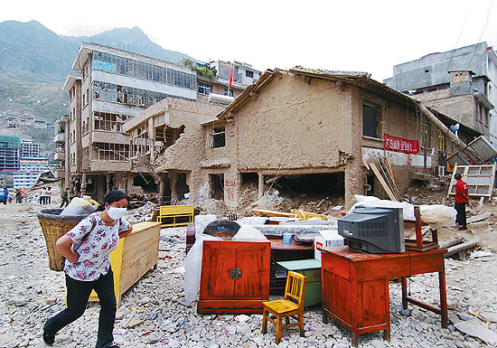 8月16日,一名妇女从被搬出的家具前走过。当日,甘肃舟曲县人民政府发布了对三眼峪、罗家峪等山洪泥石流区域土地依法紧急征用以建设防洪工程设施的通告。通告发布后,大批受灾群众从被泥石流毁坏的家中搬出还能够使用的家具、电器等生活物品,并进行转移。新华社记者 高健钧摄