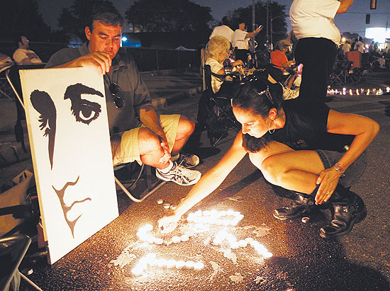 1977年8月16日,42岁的世界著名摇滚巨星、猫王埃尔维斯·普莱斯利猝死家中。今年8月16日是猫王逝世33周年。当地时间8月15日,数万名来自世界各地的歌迷,手捧鲜花、蜡烛,涌向位于美国田纳西州孟菲斯市的猫王故居,表达他们对猫王的思念。 CFP供图