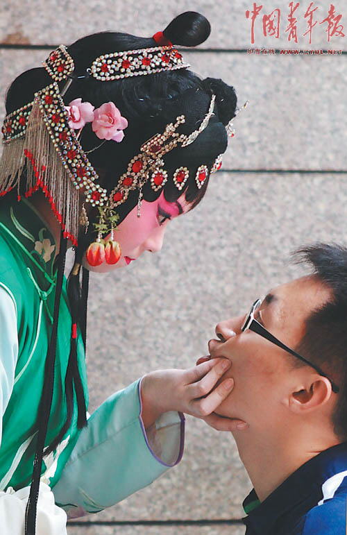 “柳梦梅”这个角色还有另一位备选演员,北大的法学女博士生胡娟在剧中反串小生。由于此前没有任何戏剧基础,很难在短短几次训练后找到感觉,所以尽管她和所有学员一起学习排练到了最后演出,但仍没有被老师安排上场。不过,她还是在化妆室里请老师给她扮上,与大家一起拍定妆照,然后跑前跑后为大家加油鼓劲儿,显得很兴奋。认真看完演出后,她便和老师同学们告别,匆匆赶往机场回老家了。“我是特地赶回来训练的,等到演出结束才回家,虽然知道自己不能登台,但是能和这么多昆曲名家学习,已经很不容易了。”兴奋之余,胡娟也不无忧虑:昆曲这样一种阳春白雪式的艺术,现在只能用大众海选的方式推广和传承,不知道对它未来的发展是好是坏。