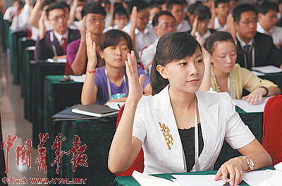 8月23日,全国学联第二十四届委员会会议上,委员举手表决。