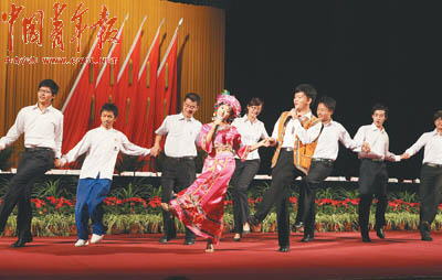 8月25日,云南代表团在全国学联二十五大第二次全体会议上表演歌舞。