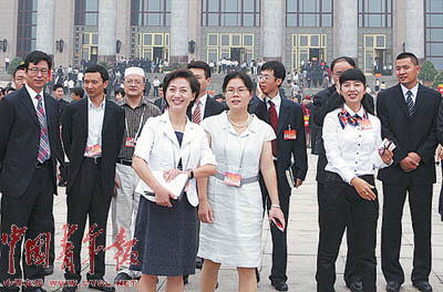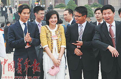 8月24日,人民大会堂前,全国青联委员吴小莉与香港特别行政区代表团的同事合影。