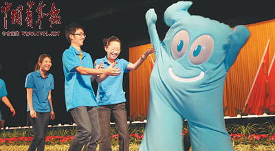 8月25日,全国学联二十五大第二次全体会议上,上海代表团表演“海宝舞”。