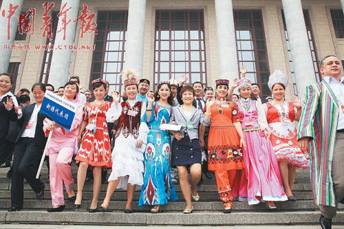 8月24日,全国青联十一届会委会、全国学联二十五大在北京人民大会堂开幕。开幕式结束后身着民族服装的委员和代表走出人民大会堂。