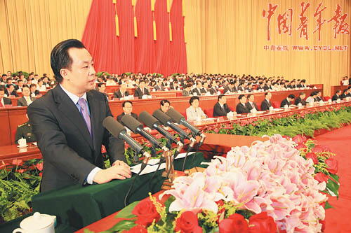 各位委员、各位代表、青年朋友们,实现中华民族伟大复兴的宏伟目标,需要一代又一代人的艰苦努力,当代中国青年肩负着崇高而神圣的历史使命。让我们紧密团结在以胡锦涛同志为总书记的党中央周围,高举中国特色社会主义伟大旗帜,以邓小平理论和“三个代表”重要思想为指导,深入贯彻落实科学发展观,团结奋斗,锐意进取,扎实工作,为夺取全面建设小康社会新胜利、开创中国特色社会主义事业新局面作出新的更大贡献!