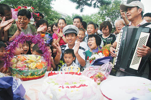 8月27日,在沈阳市皇姑区泰山交通岗旁的小广场上,人们为交警李栓良(中)庆祝生日。